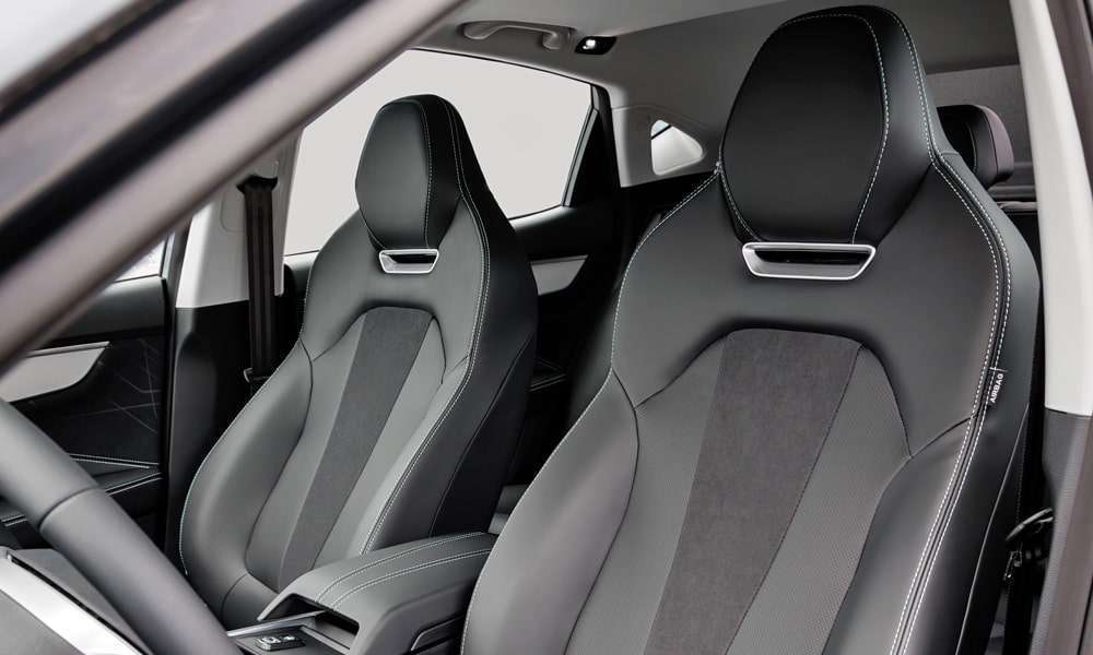 Кожаная отделка сидений черного цвета с декоративной прострочкой, перфорацией и декоративными вставками